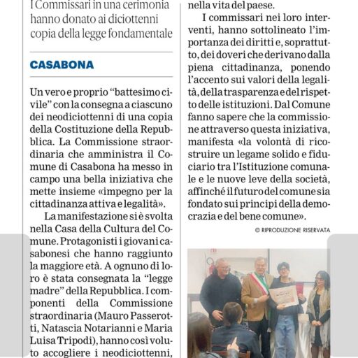 LA COMMISSIONE STRAORDINARIA DEL COMUNE DI CASABONA CONSEGNA AI DICIOTTENNI COPIA DELLA COSTITUZIONE ITALIANA.